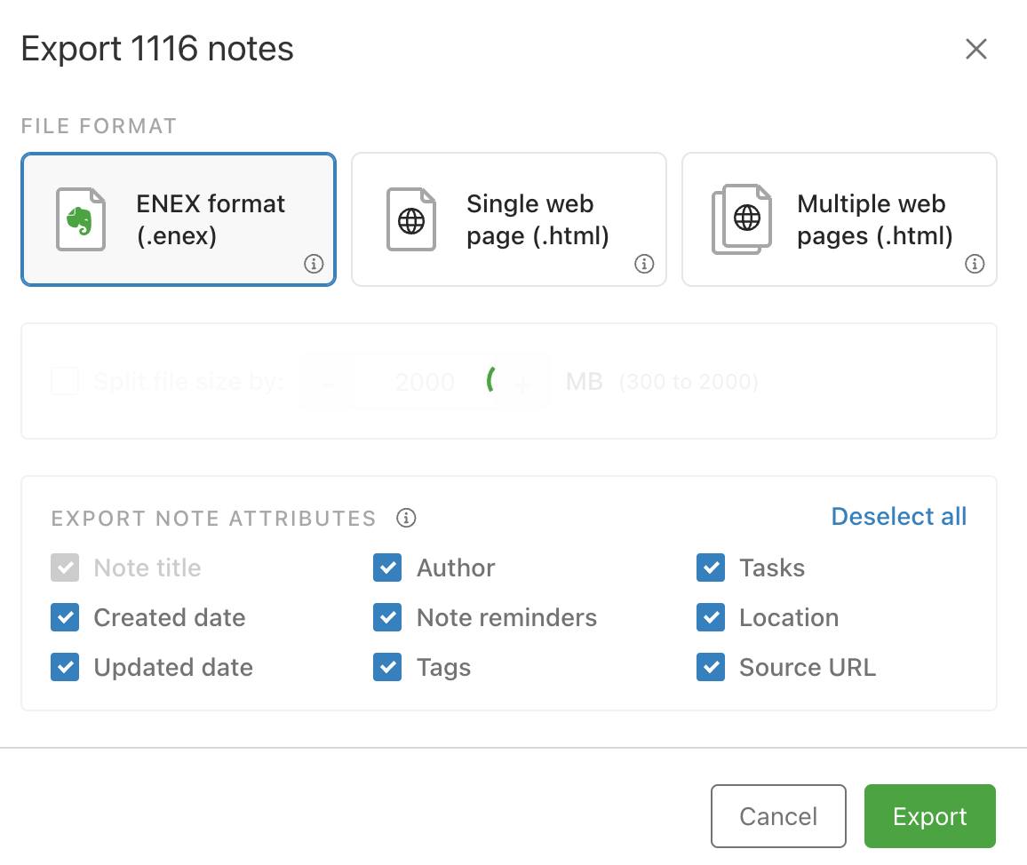 - You can select as many notes as you like (inlike Evernote that limits you to 100 notes).