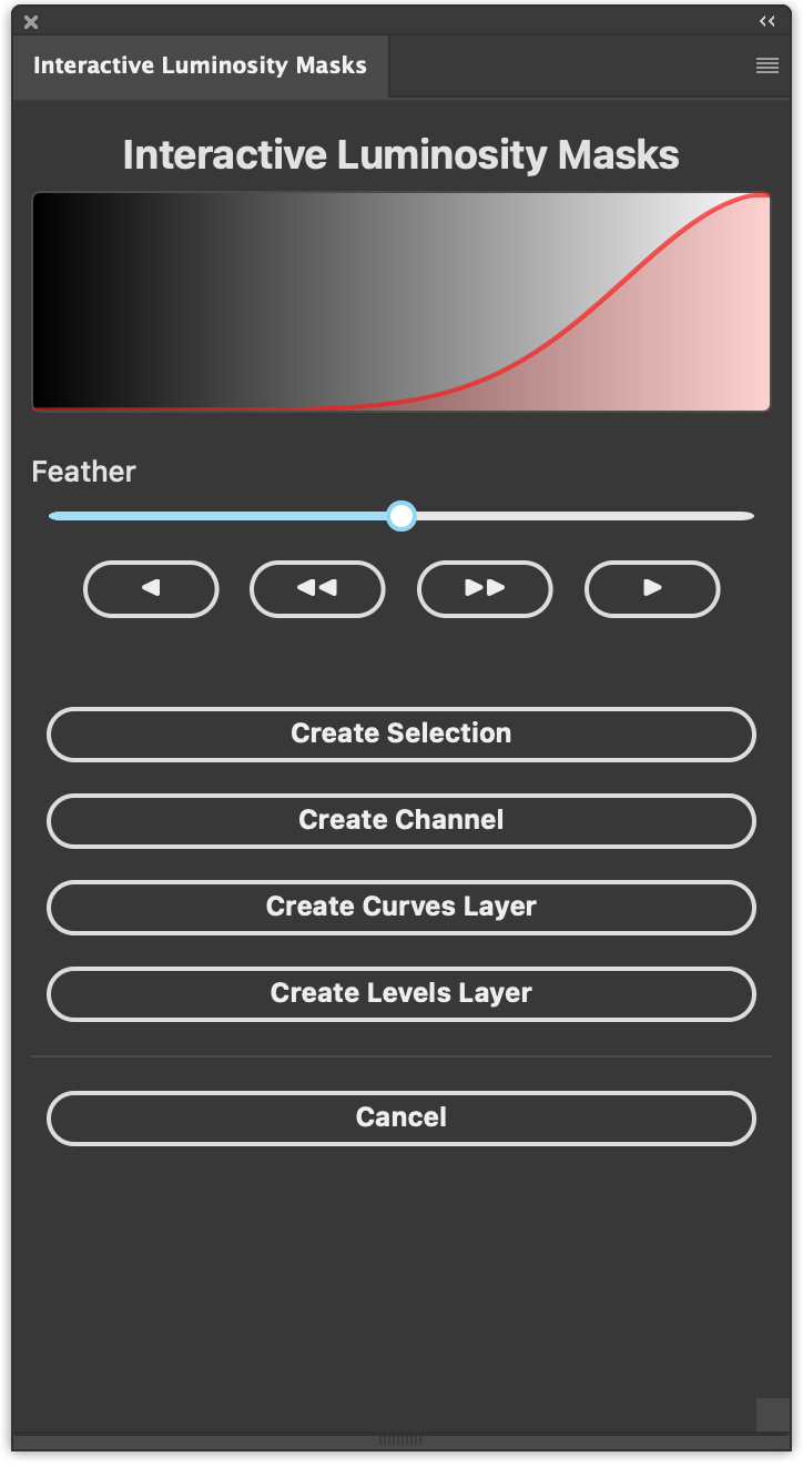 At the top of the window there is a graphical representation of the luminosity range that you select i.e., the area under the red curve. This dialog has a slider on the top which allows you to control the amount of highlights the luminosity mask will select. Moving the slider to the left will select fewer highlights, and moving the slider to the right will select more highlights. Under the slider, there are four buttons which allow you to fine-tune the selection by incrementally adjusting the slider. At the bottom of the dialog, you will find the various buttons to take action upon the chosen luminosity mask: