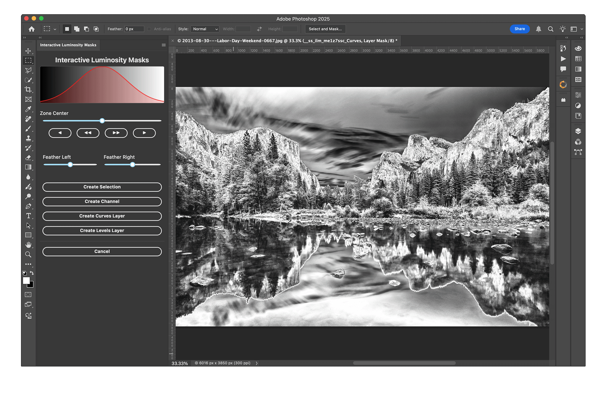 - Curves Layer: Creates a new curves adjustment layer with its layer mask set to the luminosity mask.