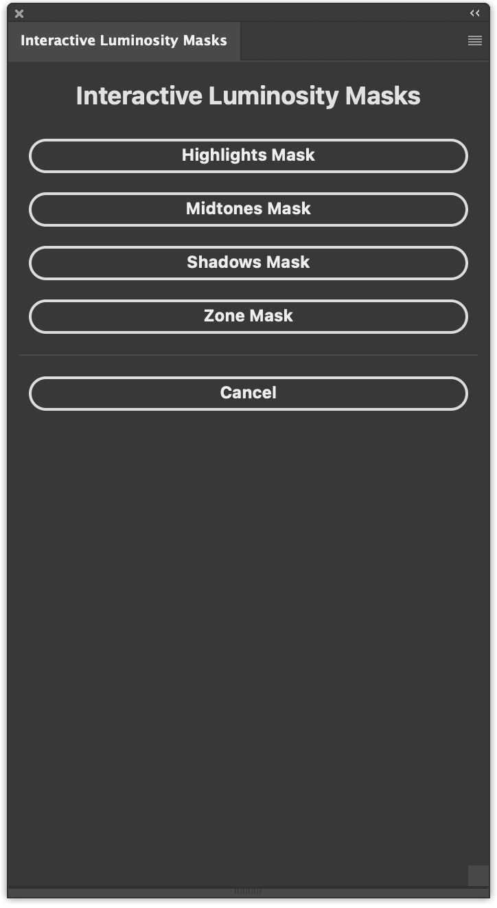 After you successfully install the panel, you can open it via Plugins > Interactive Luminosity > Interactive Luminosity Masks. When the panel window opens, it will show the main menu dialog: